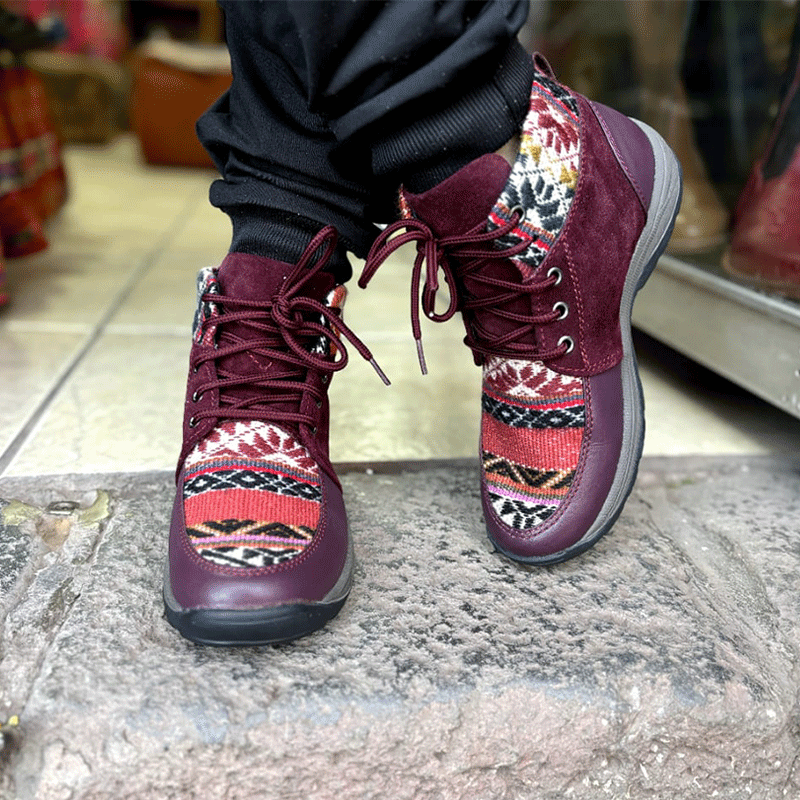 Zapatilla unisex, de cuero gamuson bovino color guinda y cuero liso color morado. Forro de algodón y tejido andino de lana natural típico del Cusco.